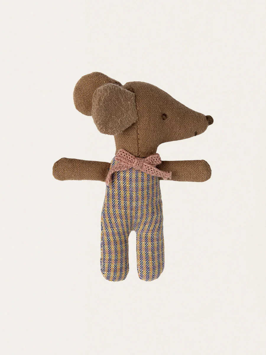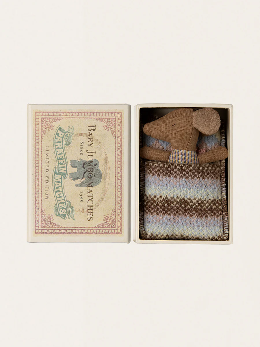 Najmłodsza w mysiej rodzinie Maileg - Myszka dzidziuś dziewczynka w pudełeczku. Z jednej strony ma zamknięte oczko, a z drugiej otwarte. Ubrana w urocze śpioszki. w komplecie kocyk - śpiworek.