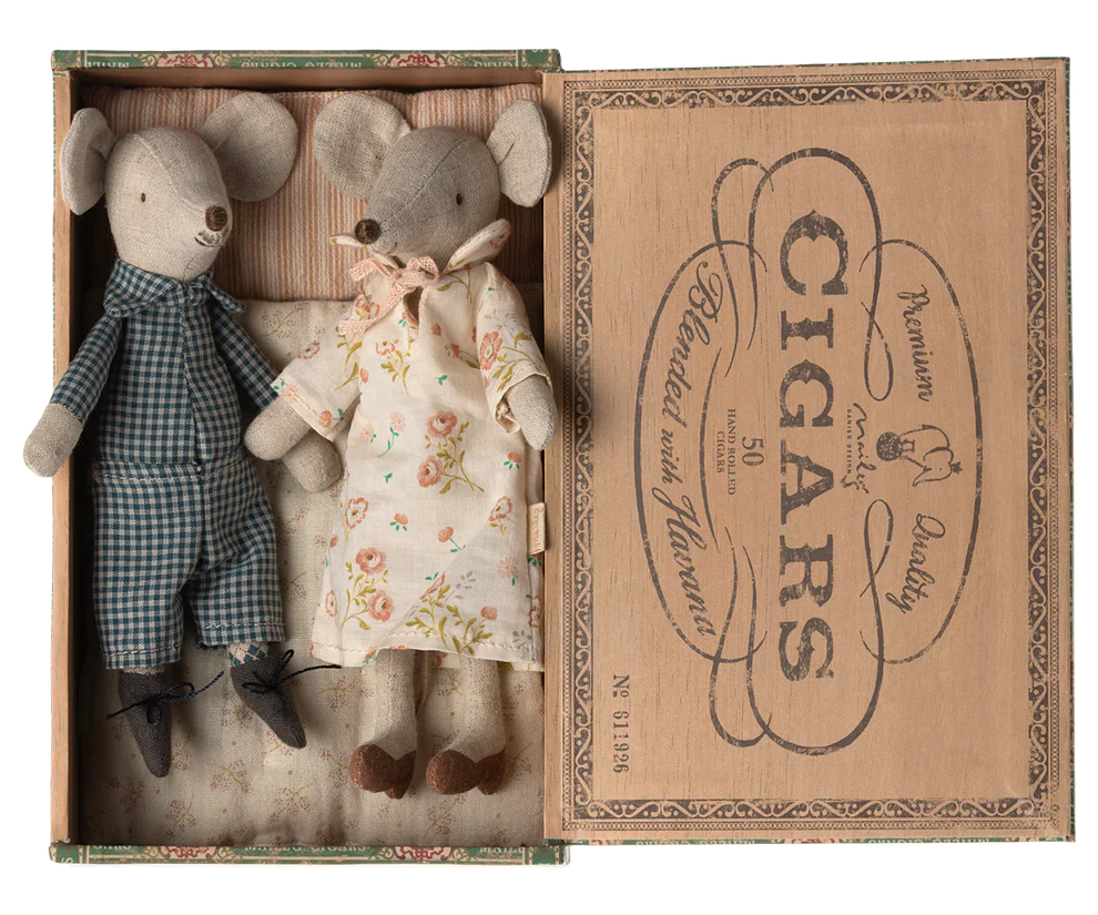 Myszki Dziadek i Babcia w pudełku po cygarach Grandma and Grandpa mice in cigarbox, Maileg